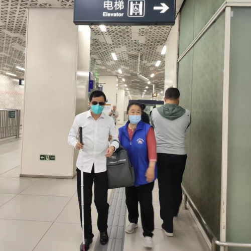志愿者韩玉春经常在6号线金台路站做志愿服务,对车站的周边情况、站型了如指掌,当她发现一名持导盲棍的视障乘客在站厅缓慢移动时,立即上前帮扶。她以手臂为“导航”,全程引导乘客完成换票、安检、刷闸、乘梯,轻声提醒关键步骤和走行路线,直至将乘客安全送至站台并与站务员细致交接。视障乘客感慨:“每次坐地铁都有工作人员当‘眼睛’,谢谢你们!”这份认可,正是对志愿者与地铁工作人员爱心服务的最好回馈。